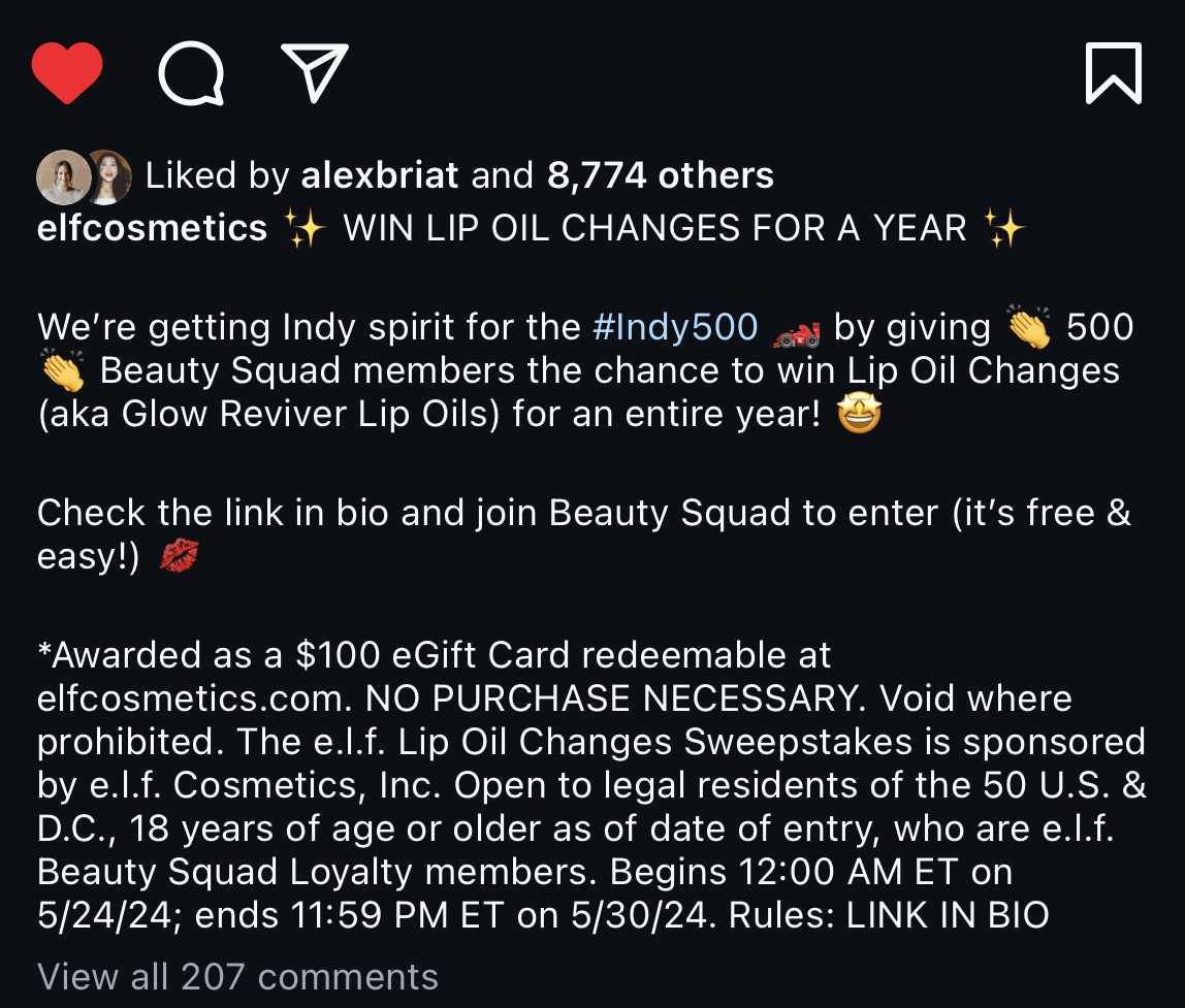 Additionally, we launched a sweepstakes offering winners free Lip Oil Changes for a year.
